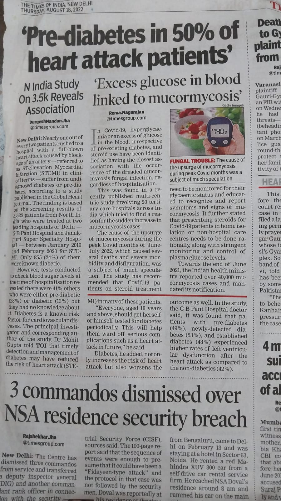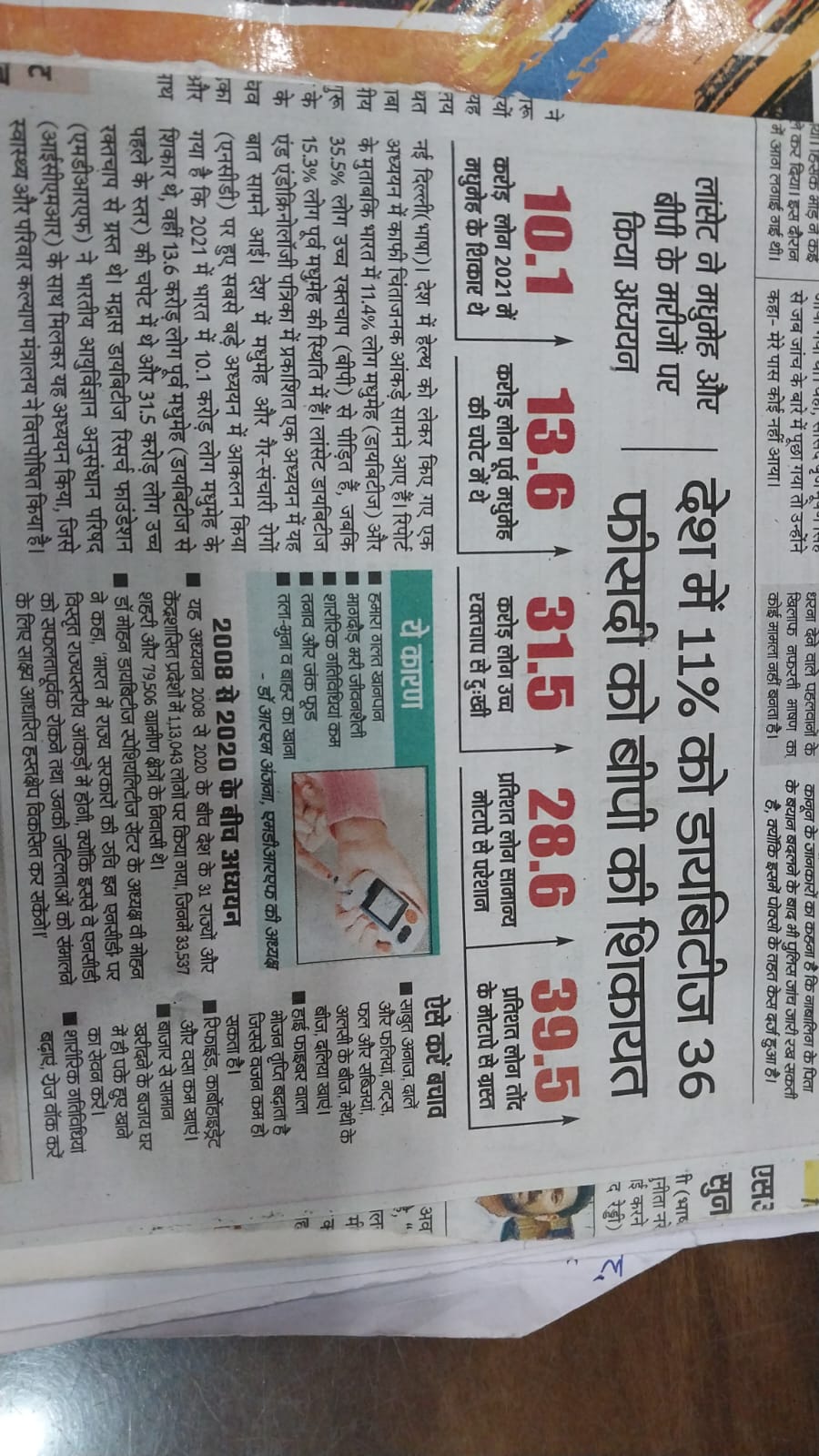 आईसीएमआर की स्टडी में सामने आया अलार्मिंग डेटा बताता है कि भारत में 10 करोड़ से ज्यादा लोगों को डायबिटीज हो चुका है और 13.6 करोड़ लोग प्री-डायबिटिक हैं। देश में 11.4% लोग डायबिटिक हैं और 15.3% प्री-डायबिटिक है। जिसका मतलब है एक चौथाई से अधिक लोग डायबिटीज की चपेट में आ चुके हैं और 35.4% लोगों को हाइपरटेंशन की समस्या हैं। भारत को एक युवा देश कहा जाता है, लेकिन युवाओं का यह देश अब बीमारो का देश बनता जा रहा हैं। जी हां इंडियन काउंसलिंग ऑफ मेडिकल रिसर्च(ICMR) ने हाल ही में एक चौंकाने वाला खुलासा किया हैं, जिसमें बताया गया है कि भारत में डायबिटीज, ब्लड प्रेशर, बेली फैट और हाई कोलेस्ट्रॉल जैसी बीमारियों का खतरा बढ़ता जा रहा है। खतरनाक है डायबिटीज, इसे जड़मूल से खत्म करिए, नहीं तो इसके साथ दूसरी बीमारियां मिलकर आपको खत्म कर देगी यह सावधान होने का वक्त है। डायबिटीज को कंट्रोल नहीं रिवर्स करिए।